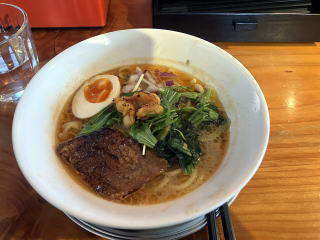 エビ味のスープに牛肉のチャーシューがのっています。なかなか珍しいラーメンでしたがおいしくいただきました。1000円。
