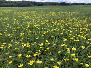 かなり広いくてジャガイモの白い花、白樺の幹、空の青がすばらし