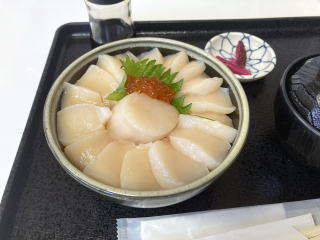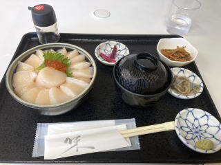 最後の晩餐は、ホタテとたこの刺身。窓からの海を眺め、岬めぐりを聞きながらいただきました。