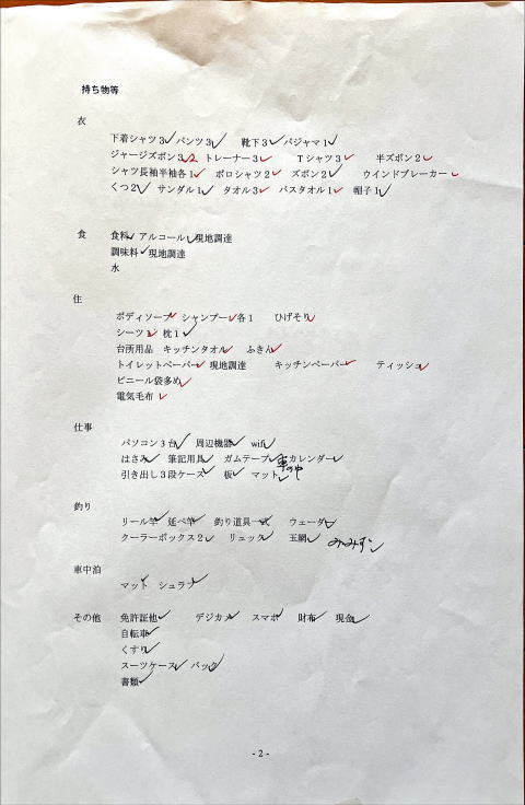 結果的に予算はすべて含めて30万円。持ち物はカテゴリーごとに、衣、食、住、仕事、釣り、車中泊、その他の7項目にわけ、