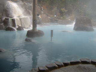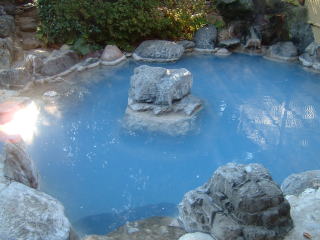 左の写真は,湯布院・庄屋の館の露天風呂です。青白濁の硫黄泉です。