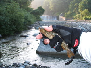 秋田の十文字町からくりこま高原に行く途中の渓流では,イワナが釣れました。