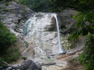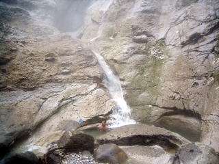 駐車場に車を停め15分ほど遊歩道を下っていくと,滝の正面に到着しました。滝の高さは20mあります。すぐ着替えて滝つぼへ。
