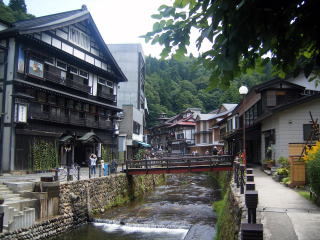 仕上げは銀山温泉です。ここは温泉に入るというより,温泉街の観光がメインです。川の両岸に歴史を感じさせる木造の旅館が立ち並んでいます。銀山温泉ならではの景観です。