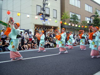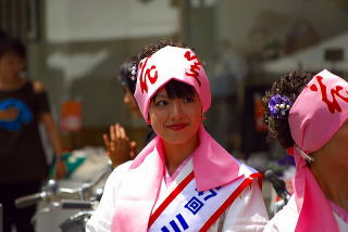 6時には花笠が始まりました。ずっと見ていると飽きてしまいますがまた行きたくなるのがふしぎです。ゲストとして森下千里が来ていました(写真中央)。右写真はミス花笠の女の子です。