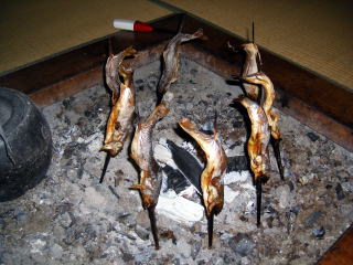 イワナ料理は,塩焼き(囲炉裏焼き)刺身,骨酒です。