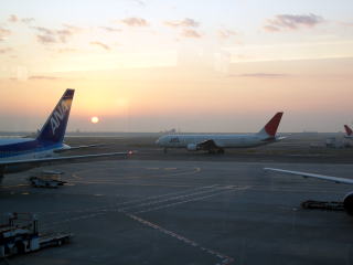 朝の羽田は天気も良好。飛行機のかげから朝日も見ることができました。