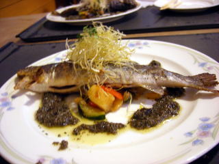 「岩魚のグリエ」というものがでました。27㎝ほどの大きめの岩魚です。イワナもいろいろな料理があるものです。おいしく頂きました。