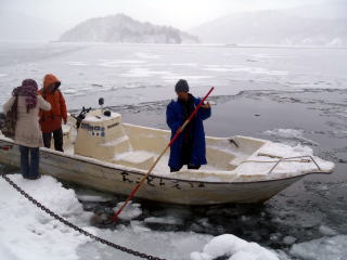 モーターボートでドーム船に向かいます。まるで砕氷船のように氷を砕きながら進み,10分ぐらいでドーム船につきました。