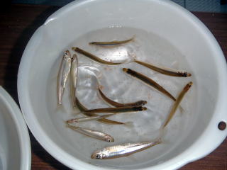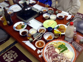 さて夕食の時間です。夕食は釣ったワカサギのほか,バーベキュー,もち料理等々。豪快な料理です。全部食べ切れませんでした。