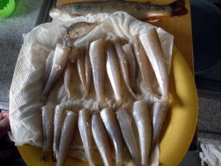 自宅に着いてから,キスの下ごしらえをしました。開きにしないで天ぷらにできるのはいいのですが、やはりもの足りません。イワナがやけに大きく見えます。