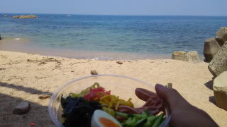 数尾釣れたところで暑さで断念。セブンの冷やし中華がお昼です。