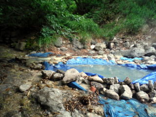 谷になっている場所を下流側に降りていくと,別の沢が流れ込んでいます。これがいい湯加減の温泉でした。ブルーシートの湯船が作ってありましたがこちらも熱すぎて入れません。