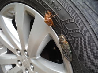 朝、帰るのに車へ近寄ると、アブラゼミがタイヤで羽化していました。すごいセミです。