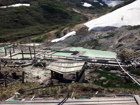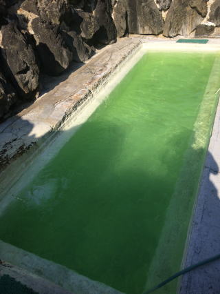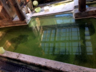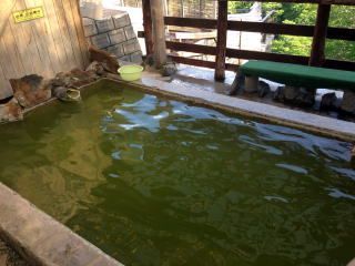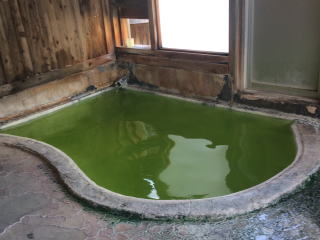 内湯のほうが緑が鮮やかでした。露天は黄緑ですが、浴槽が析出物で白くコーティングされていてとても清々しい黄緑で感動。さすが緑色温泉の雄。