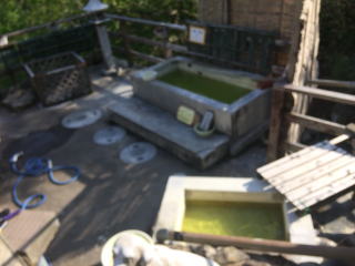 色は石塚旅館ほど鮮やかではありませんが、析出物が多く、湯面に析出物の膜が張っていました。こちらにはペット専用の浴槽もありました。