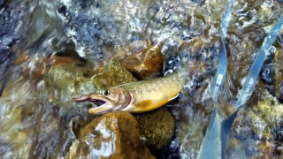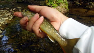 15分ほど川通しで歩いて行くと、たまりにイワナが10尾くらい目視出来るほど魚影が濃いです。そして釣れました。栗駒イワナです。