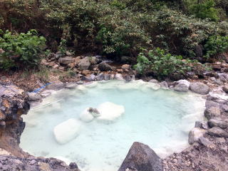 すばらしい野湯です。泉温も42℃ほどで入りやすいです。ただ、登山道の横にあるので登山道からは丸見えです。この時間、誰も歩いてはいませんが。