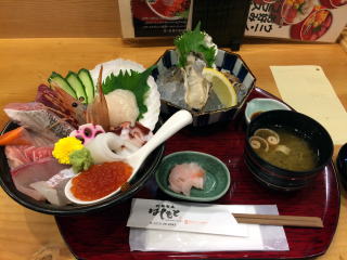 さんさん商店街は今は観光地と言っていいほど人が多いです。お宿の食事以外で初めて贅沢しました。はしもとというお店で海鮮丼と生がきです。