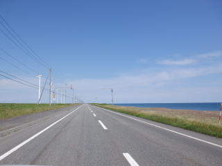天気は上々、快晴に近いです。こちらも例外でなく、車は少ない上に、右側に青い海を臨みながら北海道ならではの景色が続き気分がいいです。