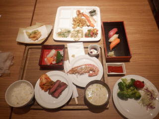 夕食はバイキング、コロナ感染防止のため、ソーシャルディスタンスのほか、ビニール手袋、おかずはいちいちふたをとり、寿司や刺身は一人分ずつカバーがあり等々。食べ始める前に一仕事した感じです。