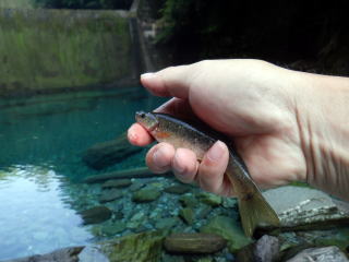 そのちょっと上流に堰堤があります。こちらです。釣りもしてしまいました。アブラハヤでした。水中写真も 仁淀ブルーです。