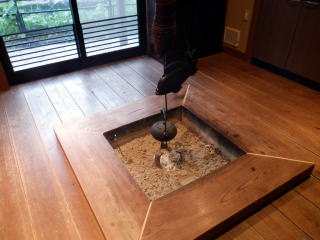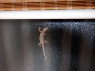 囲炉裏の間もあります。キッチンもあります。飲んだ後カップヌードルカレーを作って食べました。これで3000円少々。窓にヤモリも登場。