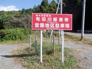 国天然記念物布田川断層の看板を見つけました。時間があったので見学に行こうとしましたがなかなか場所がわからず一時間うろうろしてやっとたどり着きました。畑のあぜ道が見事にずれていました。