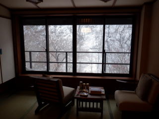 部屋は広く、窓が黒枠で外の雪景色が額に納まって絵画のようです。窓を開けるとちょうど缶ビールがおける空間があり、冷蔵庫は必要ありませんでした。あっという間にキンキンに冷えました。