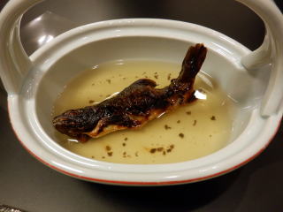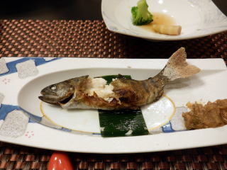 夕食は思ってたより豪華でおいしいかったです。ちゃんと山のものが中心でした。別に「岩魚の骨酒」を注文してみました。こちらは今ひとつ。やっぱり中島屋の骨酒にはかないません。それを証明したくて注文したという感じもしますが・・・。