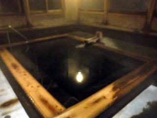 とにかく大きな湯小屋で湯船は5×15メートル、深さが1.2メートルもあります。45℃前後の温泉が湯口から注がれていますが、底からも湧いていて時々ぽわーんと気泡が立ち上るのが確認できました。湯船の真ん中に「子宝石」と呼ばれる岩がありました。そして、いい温泉は階段を降りていくのが多いですがここもそうでした。那須の雲海閣に階段の段数もひけをとりません。おまけに阿武隈川の源流を越えていきます。