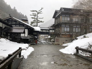 2日目、起きてみると雪がかなり積もっていました。朝食前に「法師の湯」を堪能した後、絵はがきとかに出てくる建物の撮影ポイントに。下駄で行ったのですが雪が下駄底に張り付いて、だんだん天狗の下駄?のように高くなって歩きづらくなってしまいました。