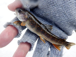 川沿いをつり下がりますが、あたりは全くないです。あきらめかけたそのとき、釣れました。ちいさいですが確実にオショロコマです。朱色の斑点が鮮やかです。がりがりにやせていました。