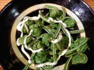 帰ってからすまし汁をつくり、最近大子と昭和村で採ってきたコシアブラの天ぷらとコゴミの醤油マヨネーズ和えを肴に