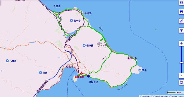 赤ライン 1日目 緑ライン2日目 青○ 函館空港