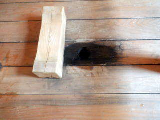 板の間に横になれる4人分のスペースがあります。ちょうど腰のあたりに木の枕らしきものが並んでいます。