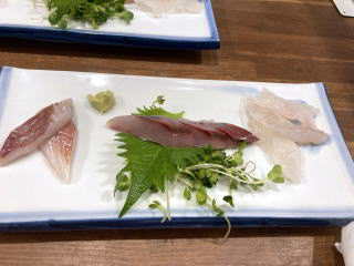 でもせっかくなので「よしお」という居酒屋に出向き、刺身セットとビールを注文。刺身セットはもちろん刺身も付いていましたが天ぷら、トリ唐揚げ、煮魚ありで、メインがなんだかわからない状態です。