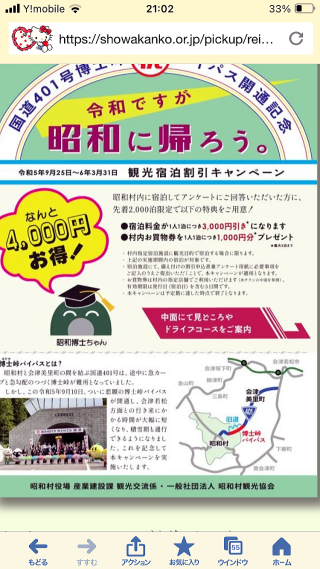 これが割引のキャンペーンのポスターです。福島県と昭和村が3000円ずつとお土産券1000円、合計7000円の割引です。いえい。