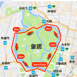 いろいろと調べてみると、「桜田門」から反時計回りに一周するのが一般的で、一周は約5キロほどです。