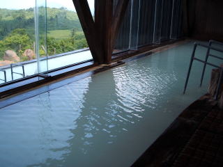 内湯と露天,それぞれ細長い浴槽で30人くらい入れそうです。内湯は前面がガラス張りになっていて景色を見ながら入浴することができます。その外に同じ形で露天が配置されています。