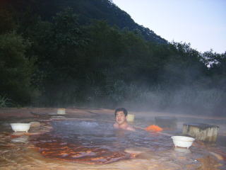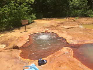 析出物で覆われた広場?中央に,ボコボコと勢いよくお湯が湧き出しています。そしてそこが自然の湯船になっています。すばらしすぎの一言につきます。