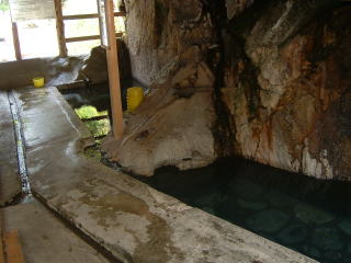 岩をくりぬいた湯船が2つあり奥の湯船の底から温泉がわいています。 足もと湧出です。