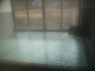 内湯は,泡付きがすばらしく,茶色の湯花が舞っています。大きなガラス窓からは,外ののどかな景色が見渡せます。