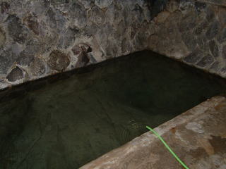 まず自噴岩風呂。10人ほど入れる半天然の浴槽があり,底の岩の割れ目から熱めの湯が湧き出していました。