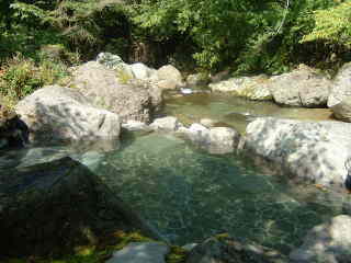 露天は川沿い2つあり 手前が適温で奥は温めのお湯が掛け流しになっていました。