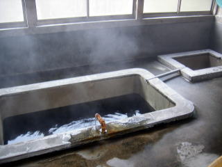 長方形の浴槽が二つありますが,小さい方は子供2人くらいしか入れない大きさで,親浴槽がいっぱいになるとパイプでそちらに注がれる仕組みです。なかなか面白い造りです。