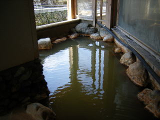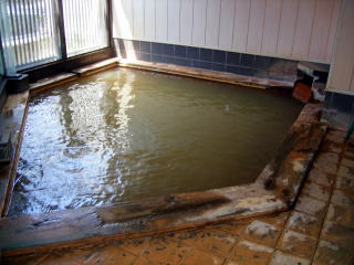 五角形で7,8人入れる内湯は,湯口では透明ですが浴槽にはいると酸化して薄茶色に濁っています。