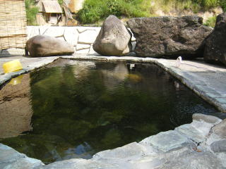 まず男湯です。5,6人はいれる内湯と石組みの露天があります。こちらは荒湯源泉(塩化物泉)でちょっと緑がかっているようにも見えます。