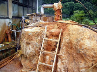 車を下りると,ゴボゴボという音が。浴室の隣にある源泉井戸から源泉ががすごい勢いで湧きだしている音でした。井戸のまわりは析出物で覆い尽くされています。