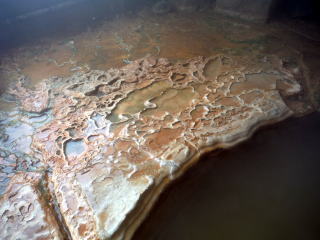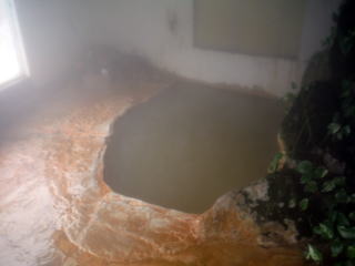 内湯の男湯は3人ほど入れる大きさでかなり深く腰くらいまであります。浴槽の周りはカルシウム泉らしく析出物で覆われ不気味な模様をつくり出しています。味は弱苦味,お湯は黄色く濁っていて鉄分も感じられます。